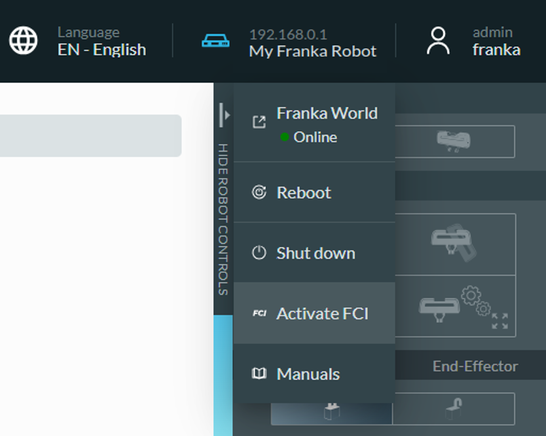 To activate FCI mode, open Desk, then release the robot brakes, and expand the menu in the top bar. Finally, click on ‘Activate FCI’.